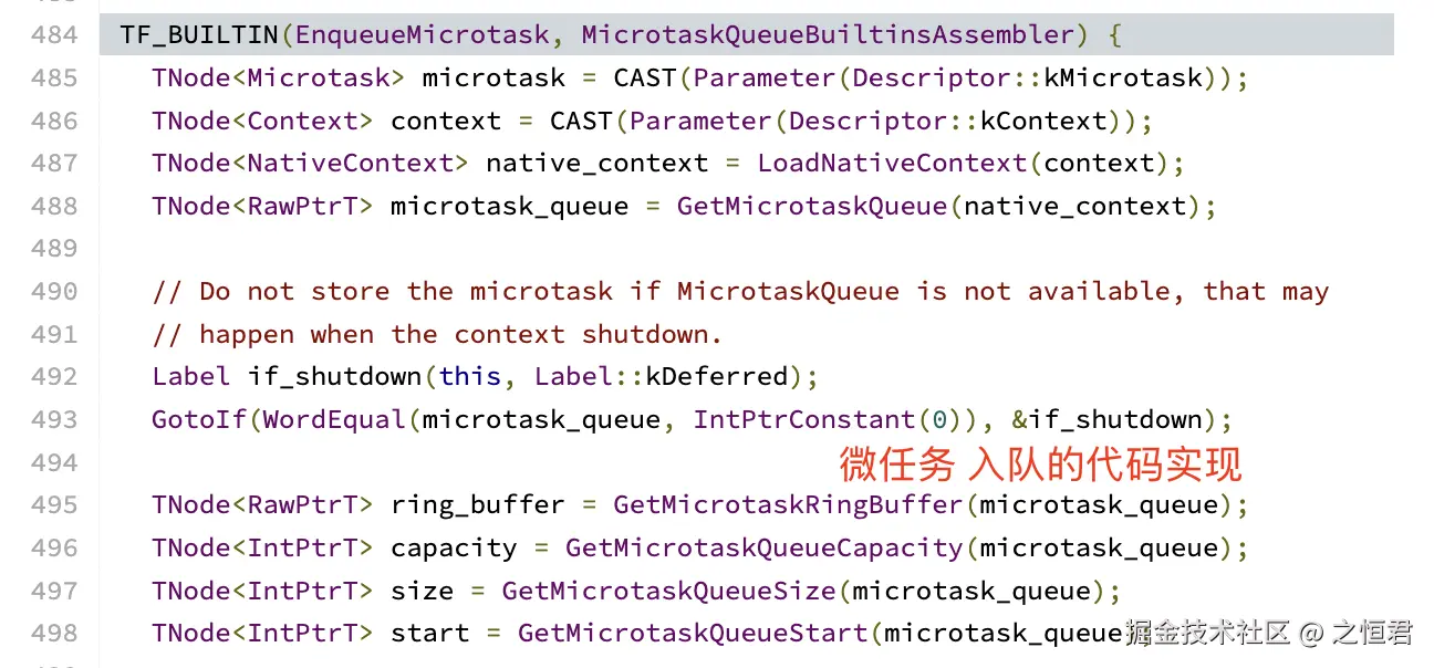 - 微任务循环由 TF_BUILTIN(RunMicrotasks) 实现:循环从 ring buffer 取出 microtask、更新 start/size,然后调用