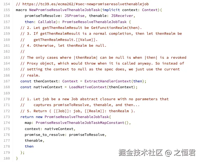 - builtin 的实现逻辑在 Torque 文件 src/builtins/promise-jobs.tq;
