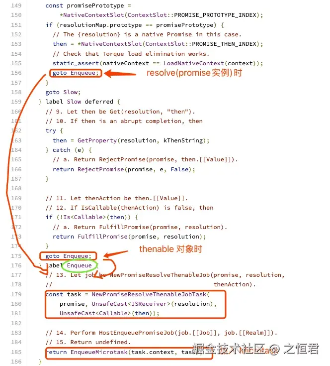 - 逻辑在 promise::ResolvePromise 中:当 resolution 不是原生 fulfilled 值且有可调用的 then 时,会进入 Enqueue 分支,创建任务并入队(见 Enqueue 段)。