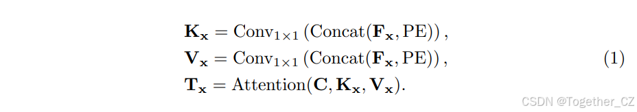 在将代价补丁特征Fx投影以获得键Kx和值Vx之前,补丁特征与位置嵌入序列PE∈R⌈H/8⌉×⌈W/8⌉×Dp进行拼接。给定一个二维位置p,我们按照COTR将其编码为长度为Dp的位置嵌入。最后,通过使用查询、键和值进行多头点积注意力,源像素x的代价图可以总结为K个潜在表示Tx∈RK×D。通常,K×D≪H×W,因此潜在总结Tx为每个源像素x的每个H×W代价图提供了更紧凑的表示。对于图像中的所有源像素,总共有(H×W)个二维代价图。它们的总结表示可以因此转换为一个潜在的四维代价体T∈RH×W×K×D。