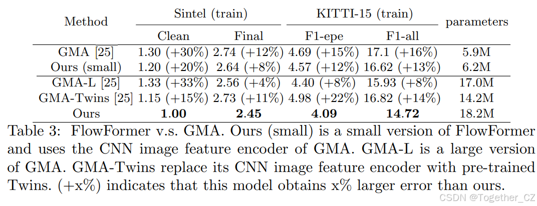 FlowFormer vs. GMA。 我们使用GMA的设置训练所有模型。完整版本的FlowFormer有18.2M参数,比GMA大。其中一个原因是FlowFormer使用ImageNet预训练的Twins-SVT的前两个阶段作为图像特征编码器,而GMA使用CNN。我们在表3中提供了一个实验,以在相同设置下比较FlowFormer和GMA。我们首先提供了一个小型版本的FlowFormer,使用GMA的CNN图像特征编码器,并设置K = 4,D = 32,AGT×1。尽管小型版本的FlowFormer(表示为'Ours (small)')与完整版本的FlowFormer相比性能显著下降,但在所有指标上仍然优于GMA。我们还设计了两个增强的GMA模型,并将它们与完整版本的FlowFormer进行比较,以证明性能改进不仅仅来自于添加更多参数。第一个表示为'GMA-L',是GMA的大型版本,第二个表示为'GMA-Twins',它也采用预训练的Twins作为图像特征编码器。在此实验中,我们在FlyingChairs上使用120k次迭代训练所有模型,在FlyingThings上使用120k次迭代训练。类似于将RAFT简化为RAFT(小型),GMA-L通过加倍特征通道来扩大GMA,有17M参数,与FlowFormer相当。然而,其性能在Sintel clean上下降,比FlowFormer大33%的误差。GMA-Twins用ImageNet预训练的Twins-SVT替换CNN图像特征编码器,正如FlowFormer所做的那样。GMA-Twins对GMA的最大改进是在Sintel clean上,但它仍然比FlowFormer大15%的误差。GMA-Twins不会导致其他指标的显著误差降低,甚至在KITTI-15上更差。总之,FlowFormer的性能改进不是来自于更多参数,而是来自于架构的新颖设计。