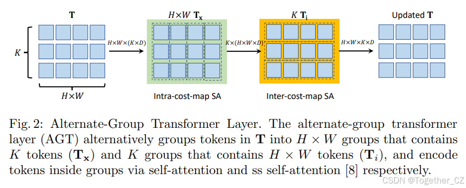 潜在代价空间中的注意力。 上述两个阶段将原始的四维代价体转换为潜在且紧凑的四维代价体T。然而,直接对四维代价体中的所有向量应用自注意力仍然过于昂贵,因为计算成本随标记数量呈二次方增长。如图2所示,我们提出了一种交替分组Transformer层(AGT),以两种相互正交的方式对T中的标记进行分组,并在这两个组中交替应用注意力,这降低了注意力的成本,同时仍然能够在所有标记之间传播信息。第一种分组是针对每个源像素进行的,即每个Tx∈RK×D形成一个组,并在每个组内进行自注意力。