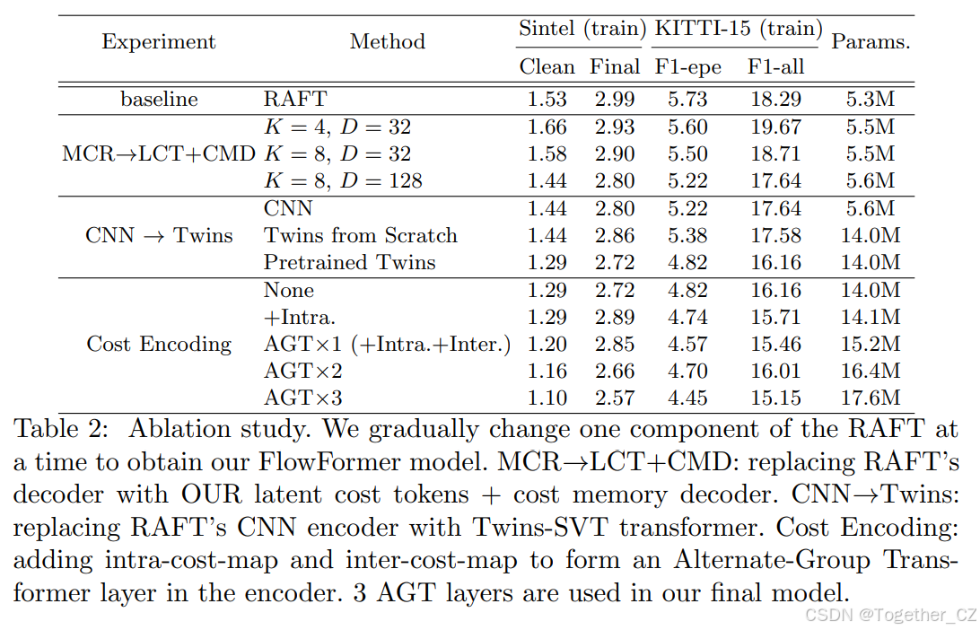 MCR → LCT+MCD。 潜在标记的数量K和标记维度D决定了代价标记可以编码的代价体信息量。从K = 4,D = 32到K = 8,D = 128,AEPE降低,因为代价标记总结了更多的代价图信息,并有利于残差光流回归。潜在代价标记能够总结整个图像的信息,我们的MCD可以通过共注意力从它们中吸收感兴趣的信息,而RAFT的MCR解码器仅在光流引导的局部窗口内检索多级代价。因此,即使在我们的编码器中没有AGT层,LCT+MCD仍然比RAFT的MCR解码器表现更好。