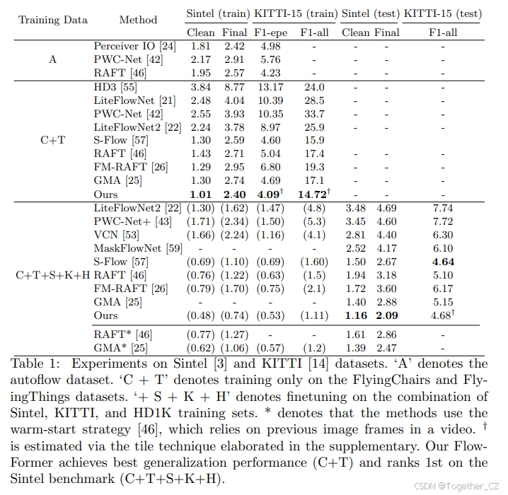 表1:在Sintel和KITTI数据集上的实验。'A'表示autoflow数据集。'C + T'表示仅在FlyingChairs和FlyingThings数据集上进行训练。'+ S + K + H'表示在Sintel、KITTI和HD1K训练集的组合上进行微调。*表示这些方法使用热启动策略,依赖于视频中的前一帧图像。†表示通过补充材料中详述的平铺技术进行估计。我们的FlowFormer实现了最佳的泛化性能(C+T),并在Sintel基准数据集上排名第一(C+T+S+K+H)。