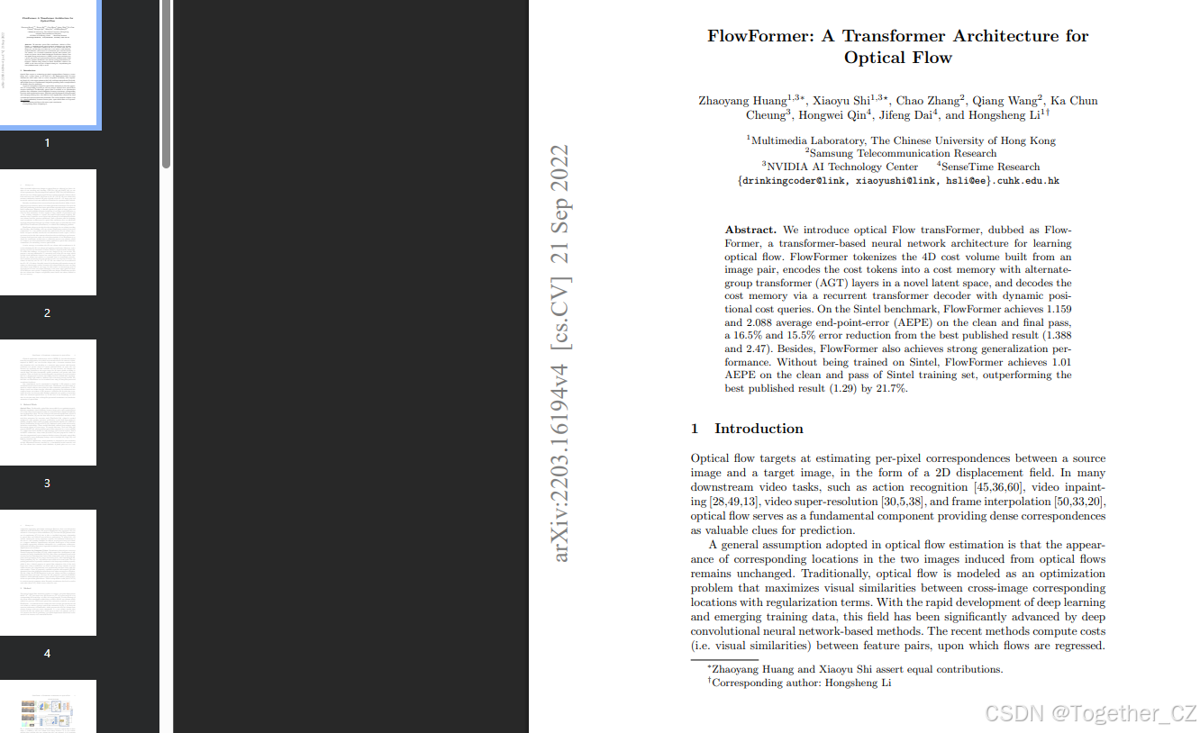 FlowFormer 是首个将 Transformer 与代价体深度融合的光流估计方法。通过紧凑的代价标记表示和 Transformer 的全局建模能力,FlowFormer 在准确性和泛化能力上均优于现有方法,为光流估计任务提供了新的思路和技术路径。这里是自己的论文阅读记录,感兴趣的话可以参考一下,如果需要阅读原文的话可以看这里,如下所示: