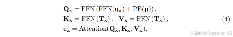 代价记忆聚合。 为了预测H×W源像素的光流,我们生成一系列(H×W)个代价查询,每个代价查询负责通过代价记忆上的共注意力估计单个源像素的光流。为了为源像素x生成代价查询Qx,我们首先根据其当前估计的光流f(x)计算其在目标图像中的对应位置p = x + f(x)。然后,我们通过在代价图Mx上以p为中心的9×9局部窗口内裁剪代价来检索局部9×9代价图补丁qx = Crop9×9(Mx, p)。代价查询Qx然后基于从局部代价qx编码的特征FFN(qx)和p的位置嵌入PE(p)来制定,这可以通过交叉注意力从源像素x的代价记忆Tx中聚合信息,