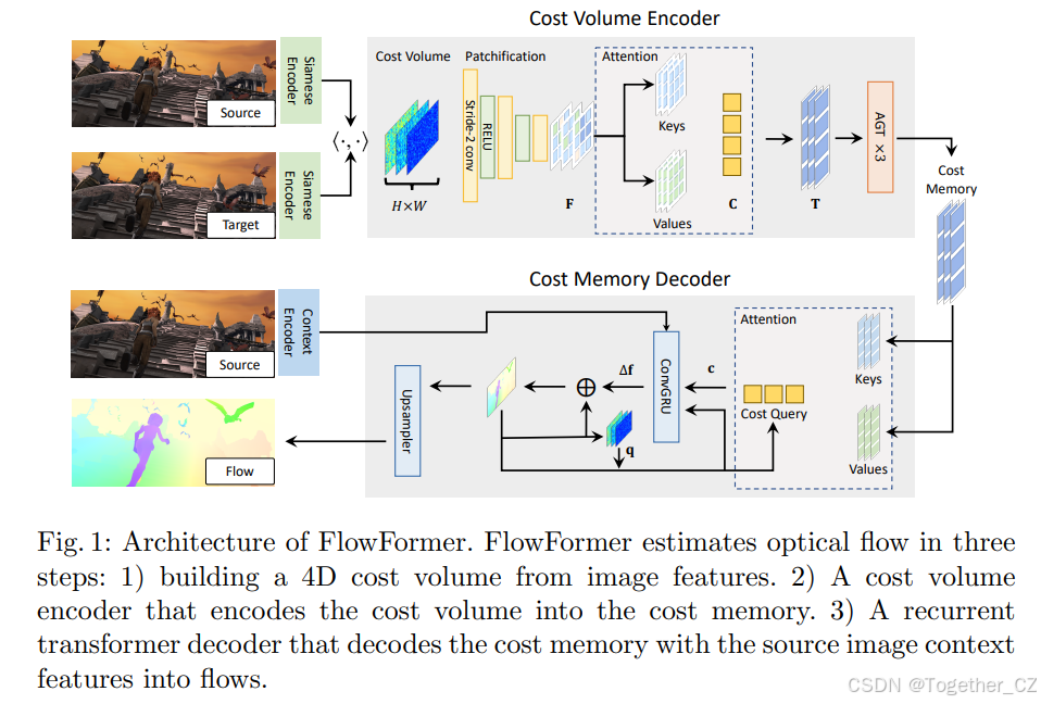 FlowFormer采用编码器-解码器架构进行代价体编码和解码。在构建四维代价体后,FlowFormer包含两个主要组件:1)一个代价体编码器,将四维代价体嵌入到潜在代价空间中,并在该空间中完全编码代价信息;2)一个循环代价解码器,从编码的潜在代价特征中估计光流。与先前的工作相比,FlowFormer的主要特点是使Transformer架构能够有效地处理代价体,这些代价体是紧凑但丰富的表示,在光流估计社区中得到了广泛探索,用于估计准确的光流。