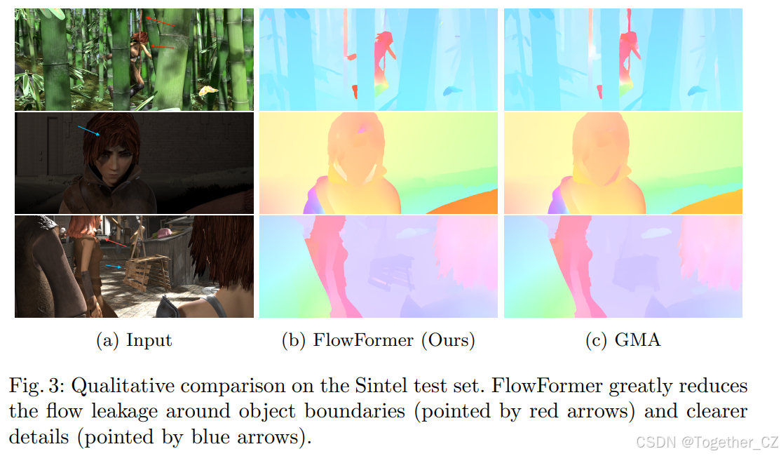 我们在图3中可视化了FlowFormer和GMA在三个示例上估计的光流,以定性地展示FlowFormer如何优于GMA。由于Transformer可以在大的感受野内编码代价信息,FlowFormer可以通过上下文信息区分重叠的物体,从而减少光流在边界上的泄漏。与GMA相比,FlowFormer在竹子和人体边界上估计的光流更加精确和清晰。此外,FlowFormer还可以恢复GMA忽略的运动细节,如头发和盒子上的孔。