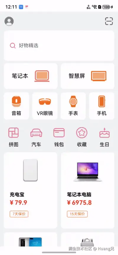 - 搜索框好物精选模块在页面向上滑动时高度逐渐变小,最终高度固定,覆盖顶部的个人头像和扫码图标