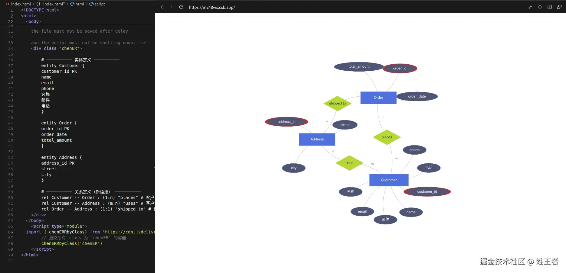 chen-er 是基于 Peggy 和 ECharts 开发的、从文本转到 ER 图 的 npm 包 ,其中,Peggy 用来将文本进行解析/序列化,ECharts 用来实现图形渲染与自动布局