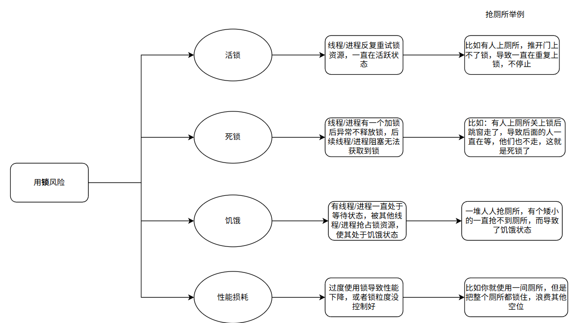 锁的使用虽能解决并发问题,但不当使用会引入新的风险,常见的有死锁、活锁、饥饿以及性能损耗等,需针对性采取规避策略。