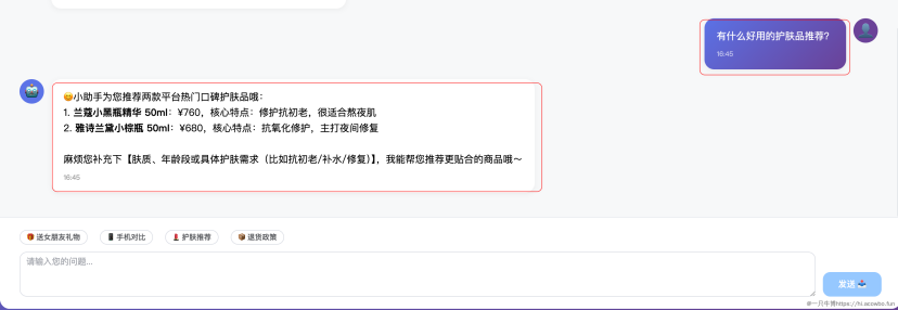 在多轮对话的测试中,验证了系统对上下文的记忆能力。当用户表示"预算只有500"后,AI能够基于之前推荐过的兰蔻小黑瓶(¥760)进行调整: