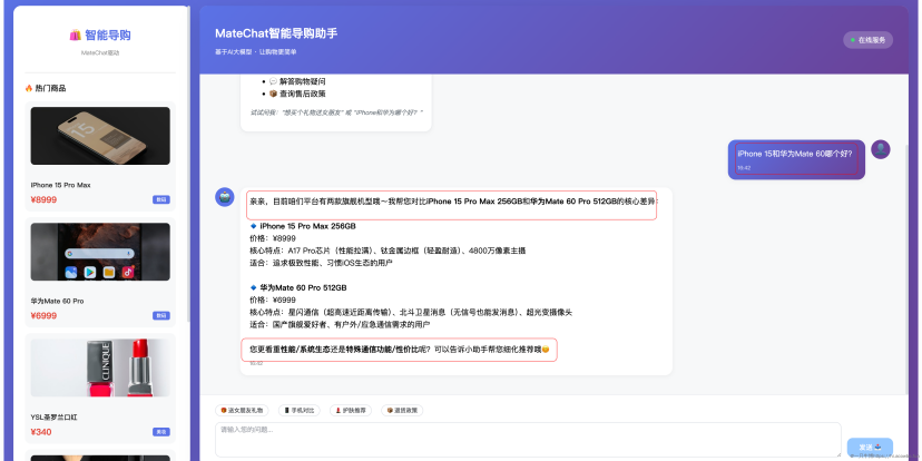 电商场景中,用户经常需要对比不同产品的优劣。系统测试了"iPhone 15和华为Mate 60哪个好?"这个典型问题: