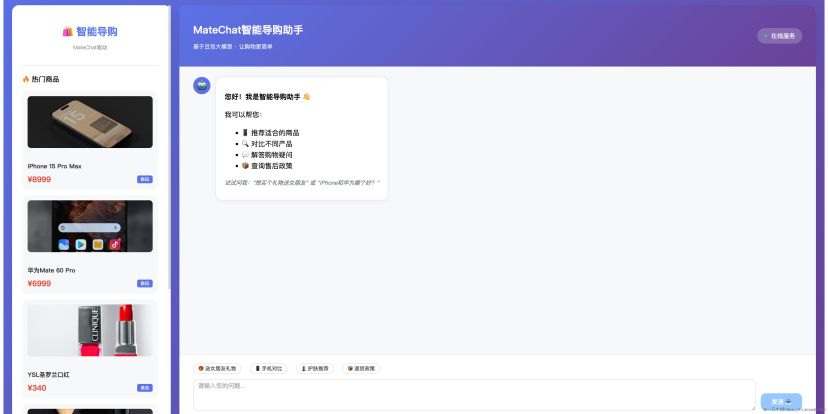MateChat作为新一代智能对话引擎,为这一问题提供了解决方案。通过将自然语言理解能力与商品知识库深度结合,能够模拟真实导购的服务体验,实现商品推荐、产品对比、售后咨询等全流程智能化。配合DevUI的现代化界面设计,可以构建出既智能又美观的导购系统,真正改变电商服务模式。