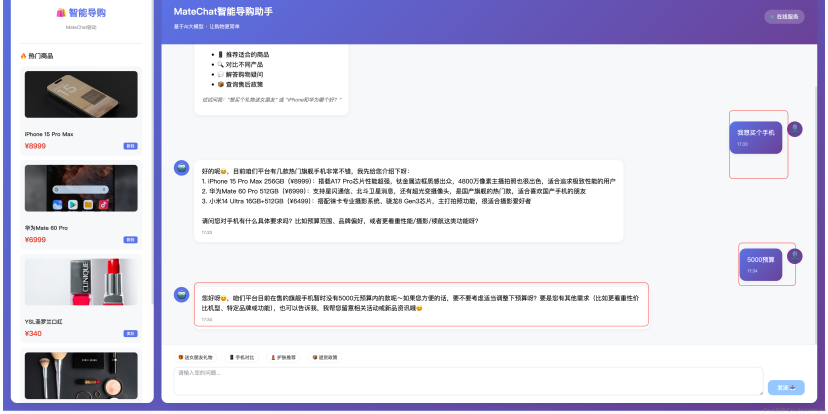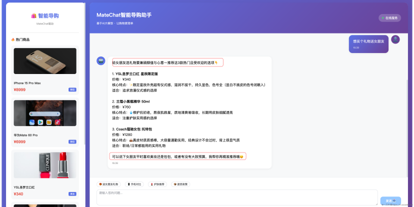 从对话内容可以看出,AI客服的回答非常自然,完全没有暴露"知识库"等技术痕迹。当用户提到预算在500-2000元之间时,AI推荐了YSL圣罗兰口红(¥340)、兰蔻小黑瓶(¥760)和Coach蔻驰女包(¥1280)三款商品,每款都附带了价格、特点和适用场景的说明。这种推荐逻辑是通过系统提示词中注入的商品数据库实现的,MateChat能够理解用户需求并从10款商品中筛选出最合适的选项。