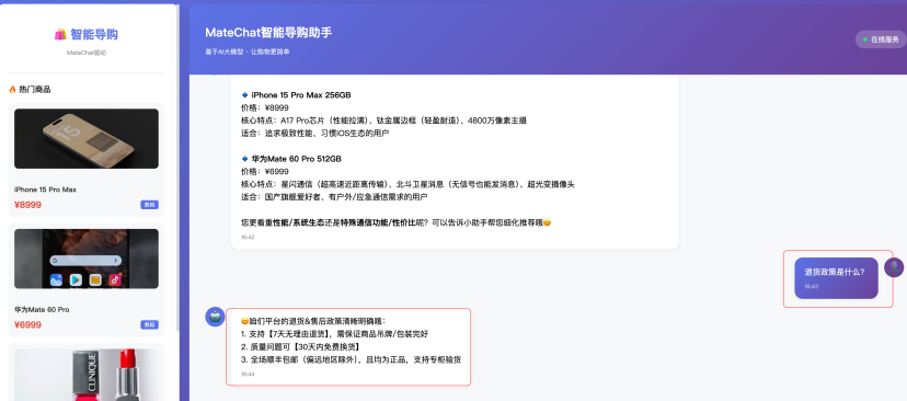 从回答可以看到,AI准确地说明了7天无理由退货(需保持包装完好)、30天质量换货、顺丰包邮等政策细节。这些信息同样来自PRODUCT_DATABASE中的售后政策部分,MateChat能够将用户问题与知识库内容精准匹配。值得注意的是,AI在回答中使用了"咱们平台"、"需要您注意"等亲切的表达方式,完全符合真实客服的语气。