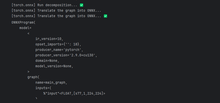 当上述代码运行成功后,我们会得到一个ONNX 模型文件。我们需要检测下我们的模型文件是否可用,我们将通过onnx.checker.check_model()进行检验,具体方法如下: