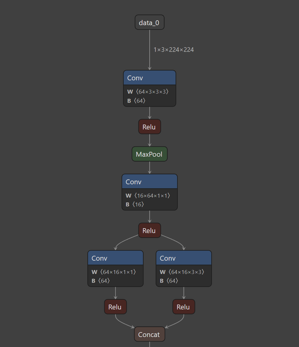 使用Netron进行可视化后,我们不仅能看到整体模型的架构,还能看到每一个节点的信息。在接下来的内容中我们将以Netron官方提供的squeezenet为例进行介绍。下面第一幅图截取自squeezenet网络,我们可以看到网络的整体流程和输入。