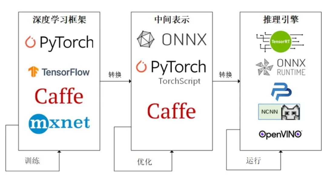 深度学习的最终目的是要实现模型的部署以方便我们的生活和解决传统方法不能解决的问题。通常人们会将模型部署在手机端、开发板,嵌入式设备上,但是这些设备上由于框架的规模,环境依赖,算力的限制,我们无法直接使用训练好的权重进行推理,因此我们需要将得到的权重进行变换才能使我们的模型可以成功部署在上述设备上。而经过工业界和学术界多年的探索,出现了以下的模型部署pipeline: