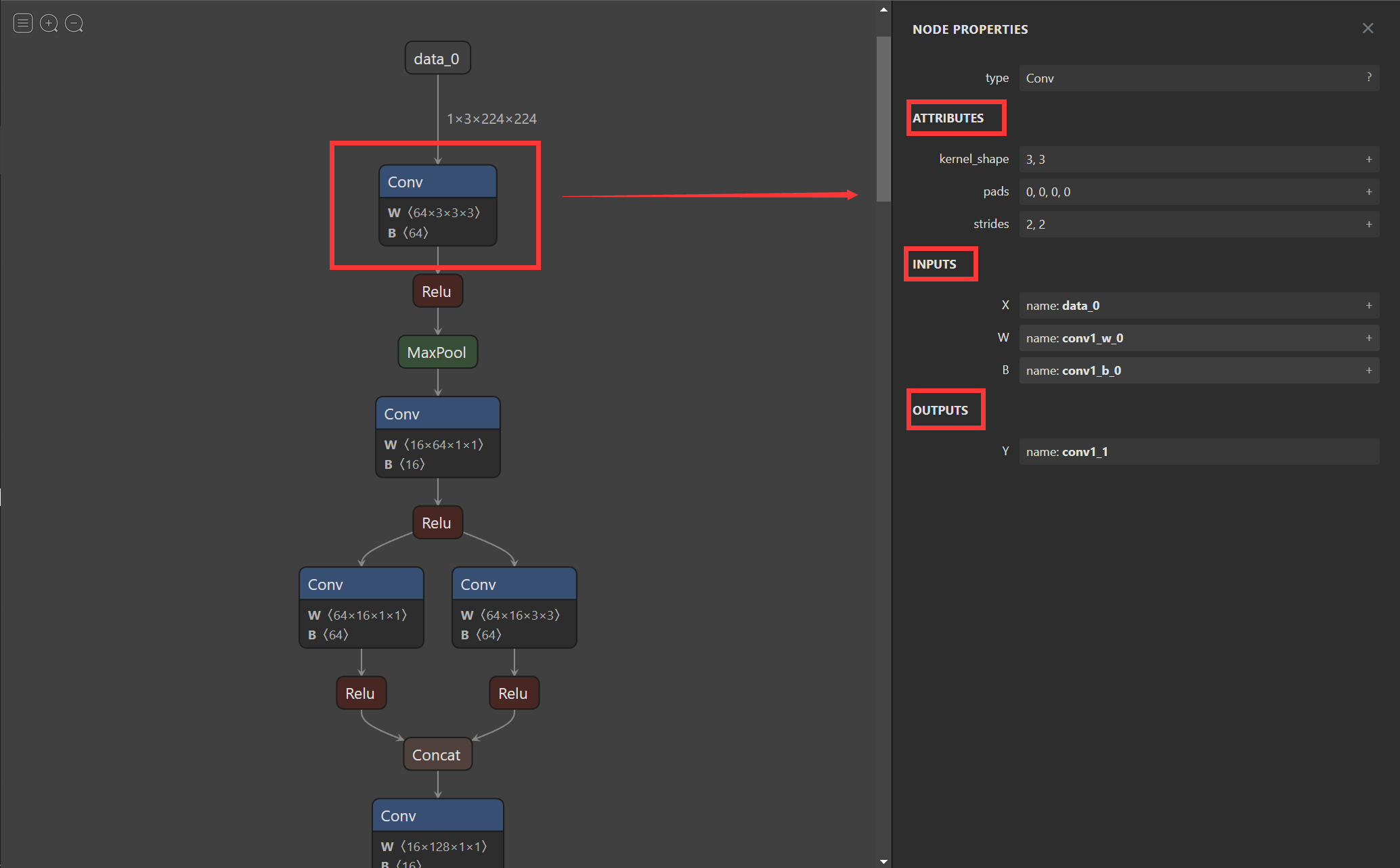 第二幅图显示了第一个Conv的信息包括kernel_size,strides,input,output等信息,同理当我们点击其他节点时也可以显示该节点的信息。