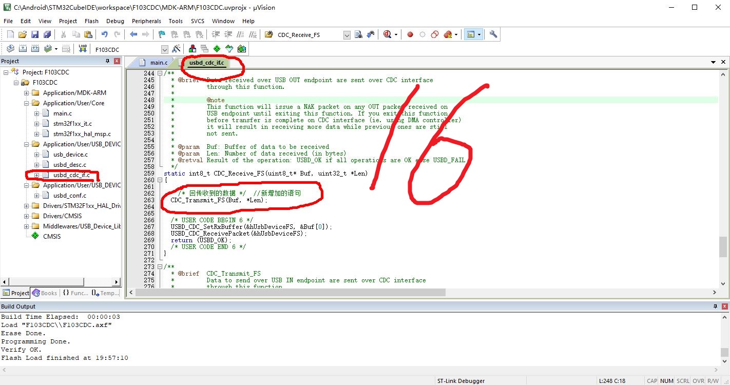 在usbd_cdc_if.c的CDC_Receive_FS中添加回传逻辑: