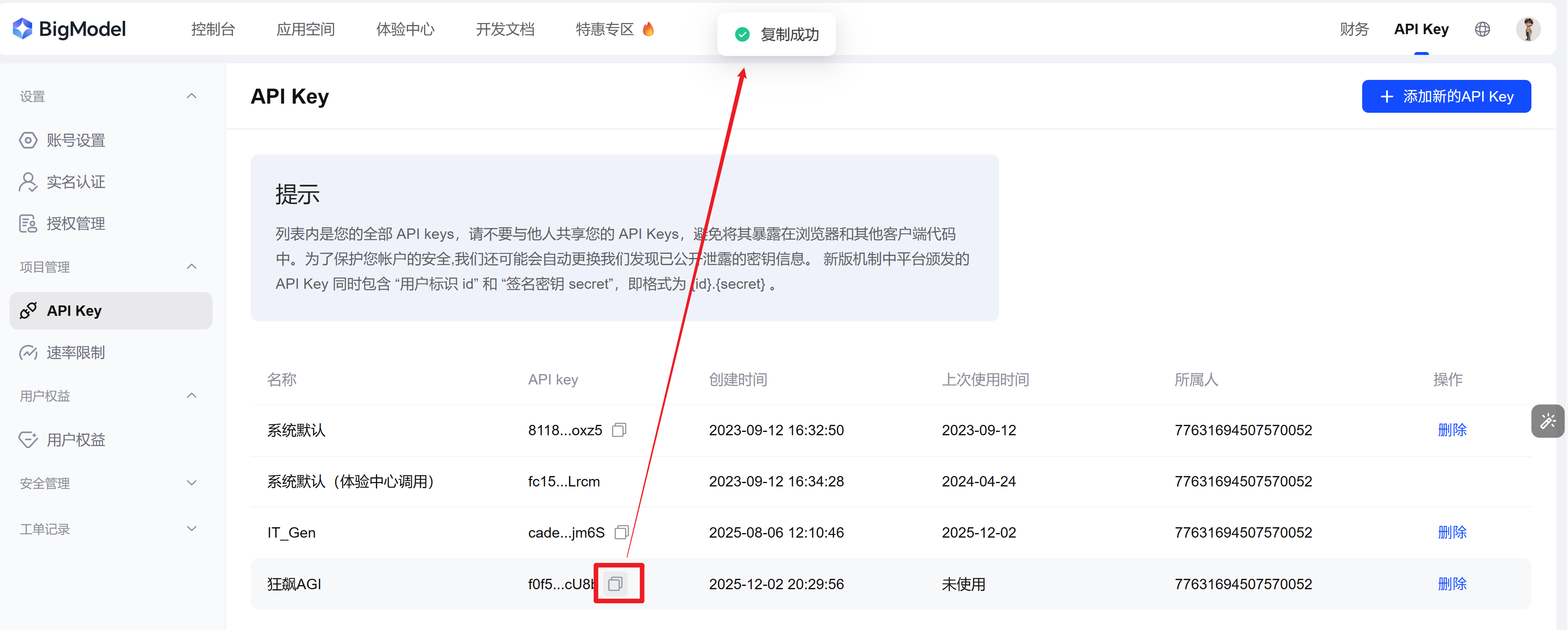 - [1.3 点击复制API Key(备用)](#1.3 点击复制API Key(备用))
