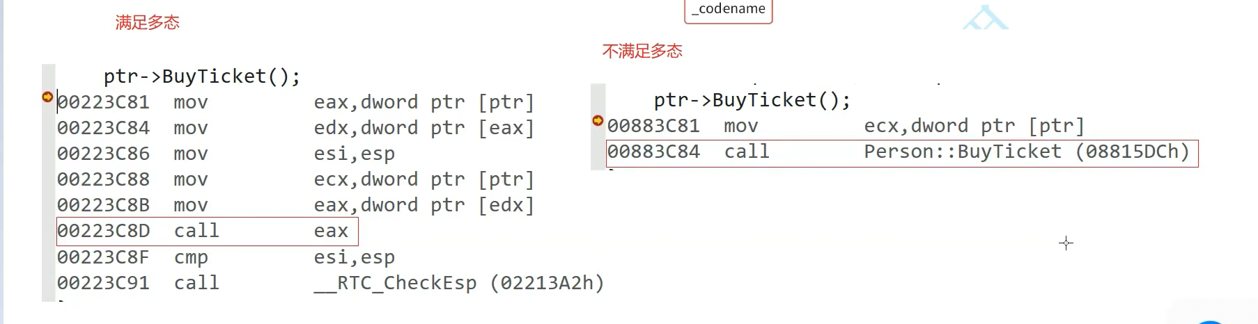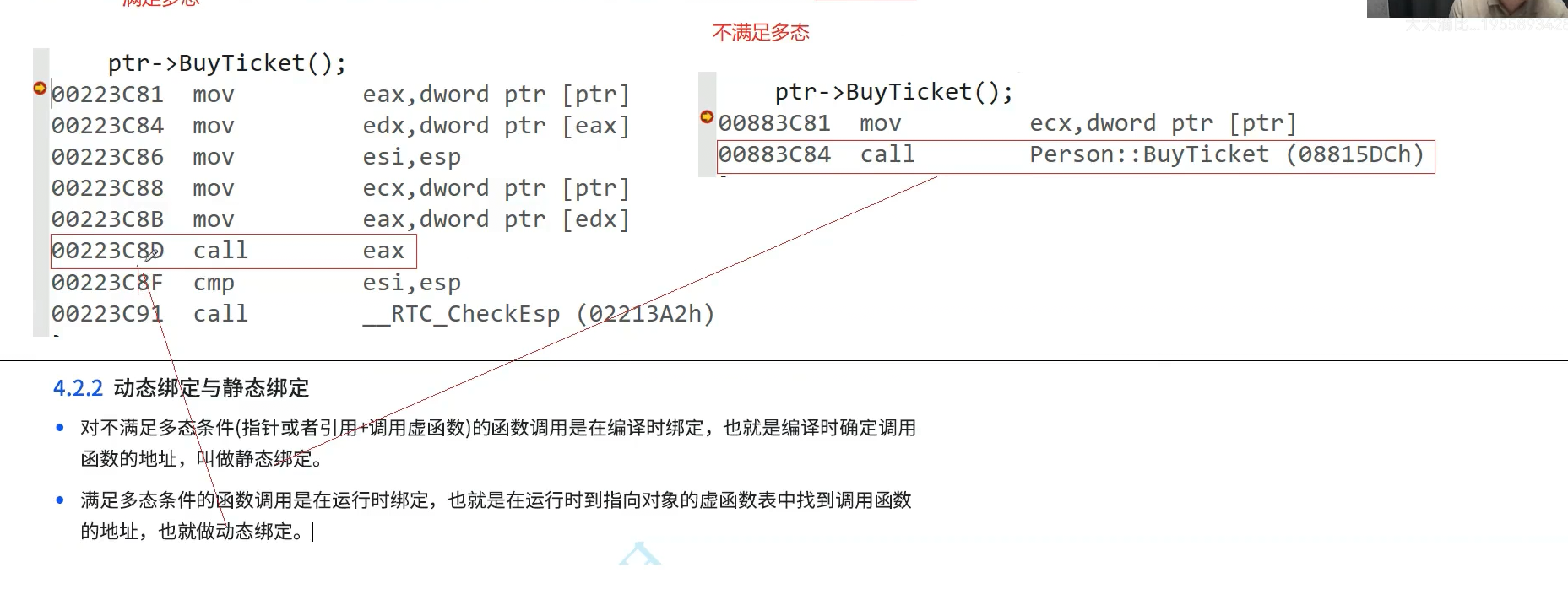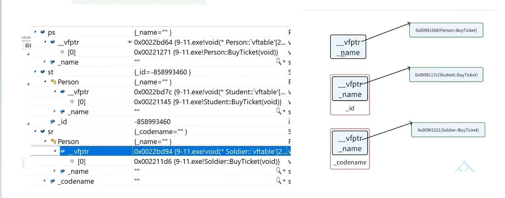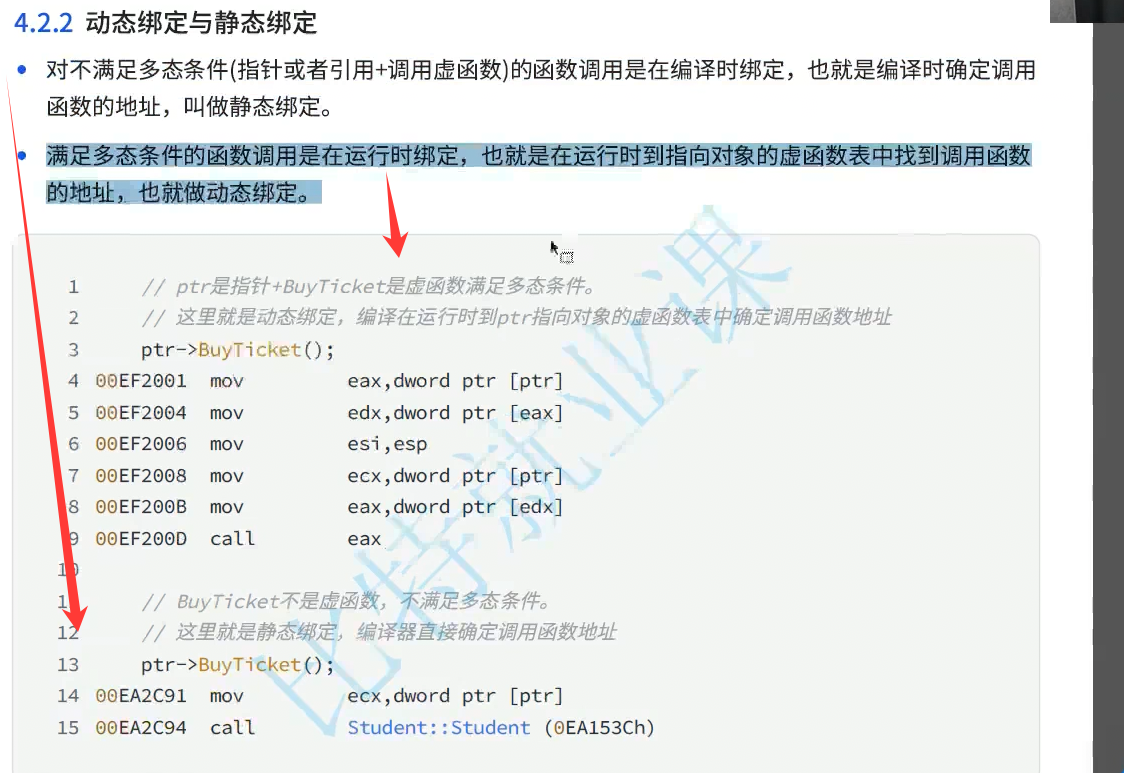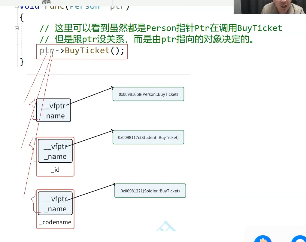 无论ptr指向person student codename 看到的都是person,切片以后看到的也是person,只是有可能是person,也有可能是子类切片切出来的person对象。汇编转换成指令是指针找到对象,去这个对象四个字节或者八个字节据情况而定取这个指针,通过这个指针找到函数指针的数组,这个表,在这个表里找到虚函数