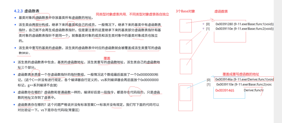 各类的虚函数表有各自的虚函数,继承父类还有自己的成员。