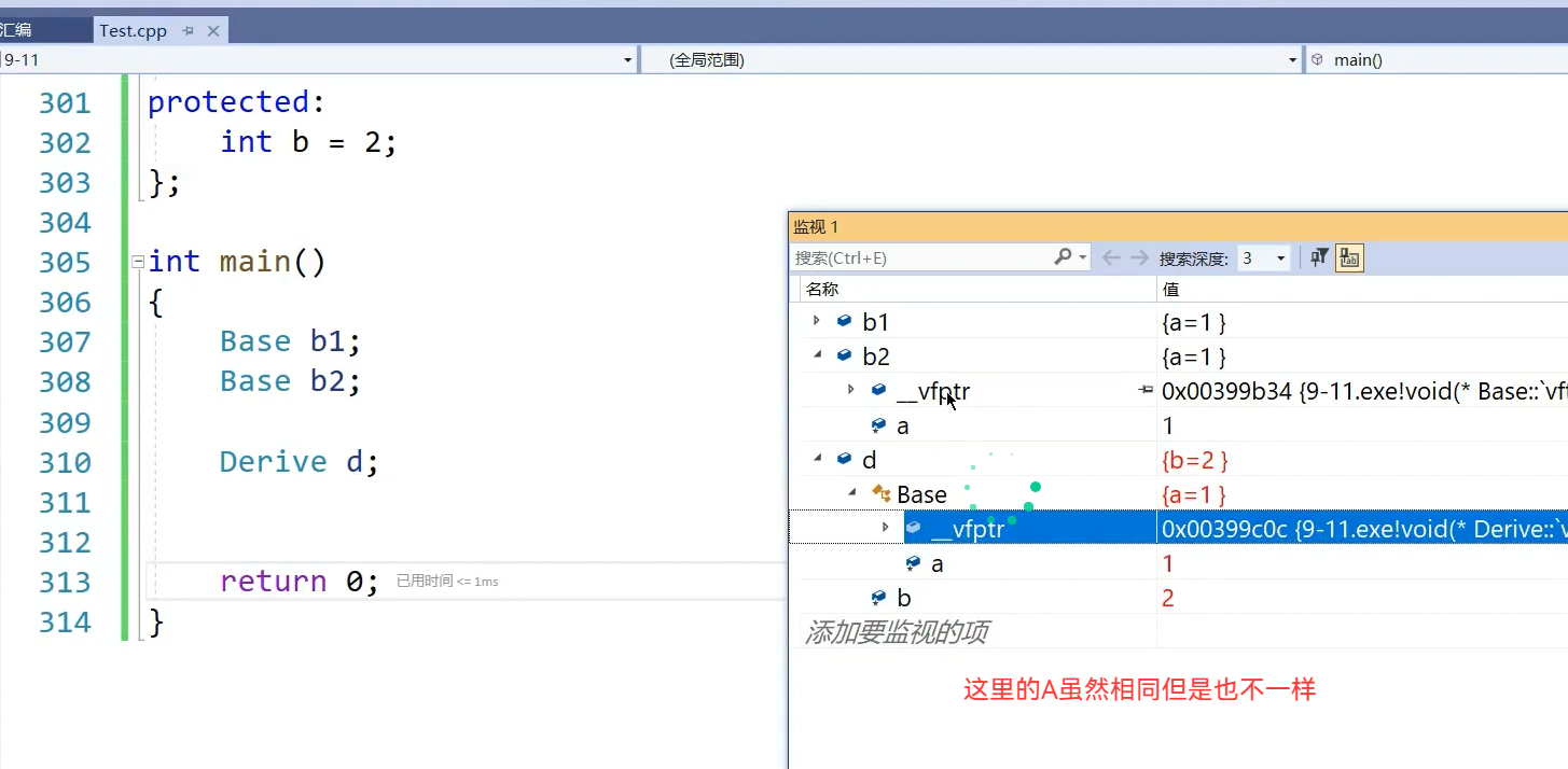 派生类的虚函数表指针是他继承的基类那一部分继承下来的,那一部分指针跟基类是不一样的。