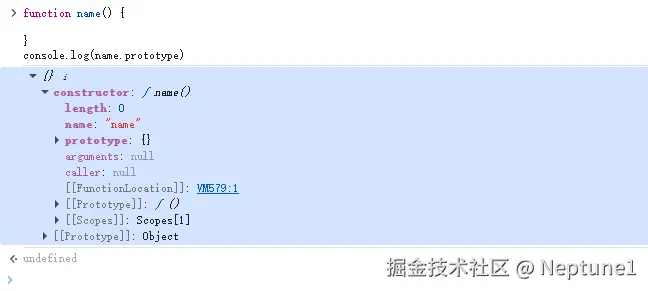 函数天生拥有一个属性(prototype),箭头函数除外,可以被函数本身访问到但是,由于不是显示属性,所以你并不能在函数体中观察到,通过在游览器中打印该属性,我们可以看到以下内容: