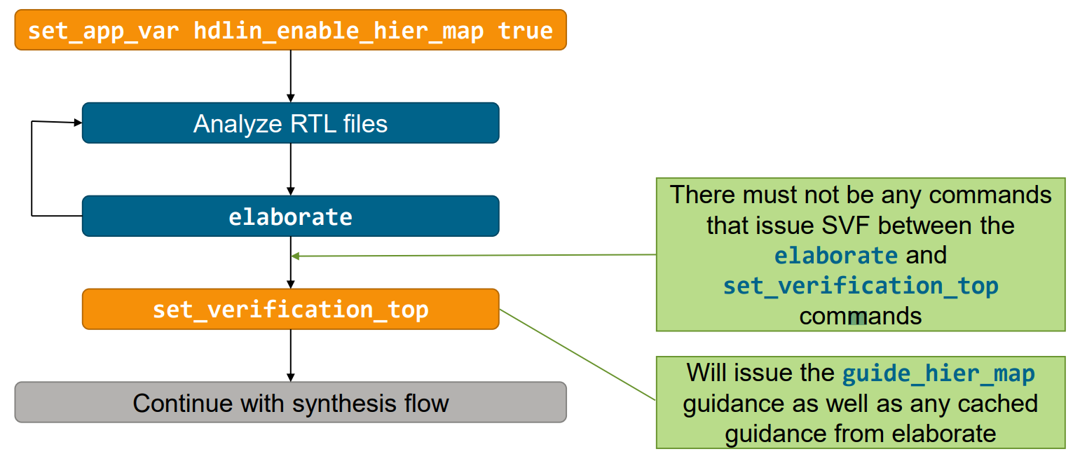 当使用set_verification_top命令时,将会把展开过程中产生的guide_hier_map命令记录在SVF文件中,并作为逻辑层次结构的基线,而后续逻辑层次结构的变化将会以常规的guide_instance_map命令记录。