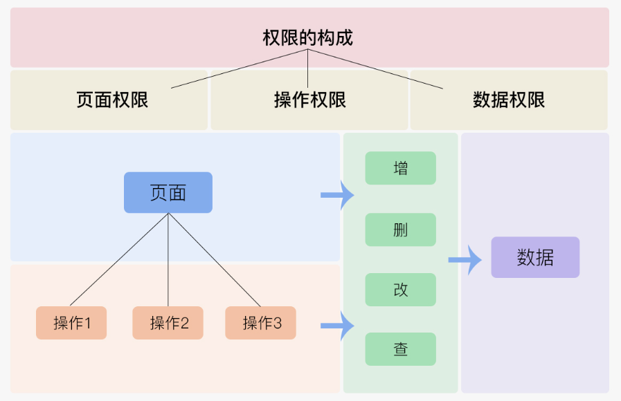 功能权限管理:指的是用户可看到哪些模块,能操作哪些按钮,因为企业中的用户拥有不同的角色,拥有的职责也是不同的。