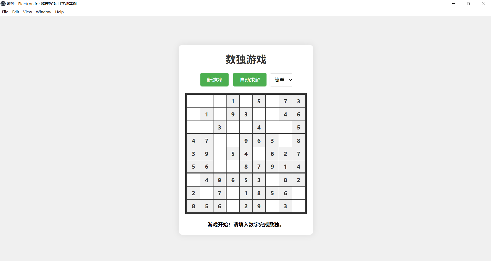 本项目是一个基于Electron 开发的数独游戏应用,专为鸿蒙PC平台设计。通过本项目,开发者可以学习如何使用Electron框架构建桌面游戏应用,同时掌握数独算法的核心实现和交互式游戏界面开发。