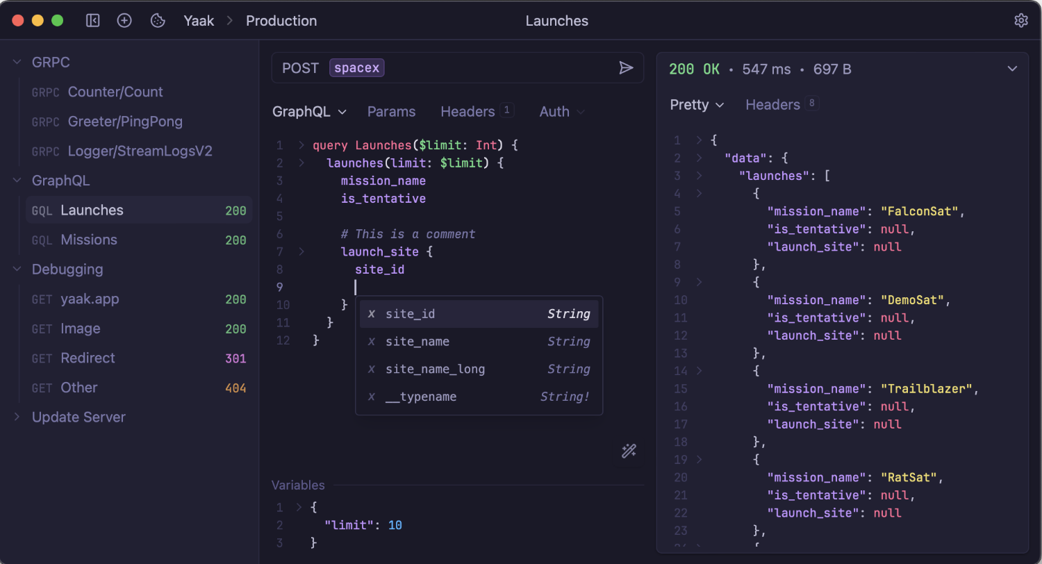 Yaak 是一个快速、隐私优先的桌面API客户端,支持REST、GraphQL、SSE、WebSocket和gRPC协议。它采用Tauri、Rust和React构建,提供离线优先的设计理念,无遥测、无风险投资、无云锁定。