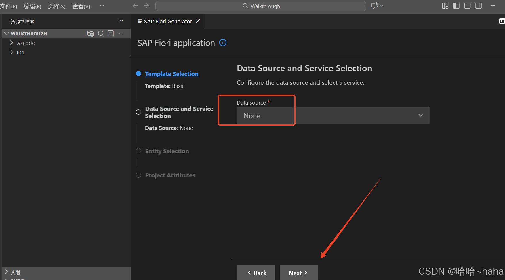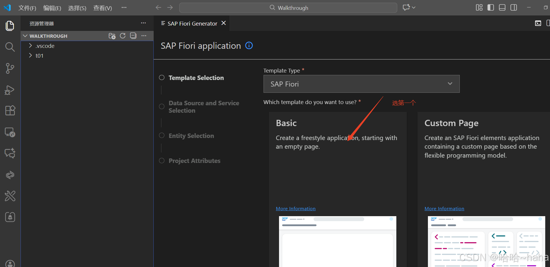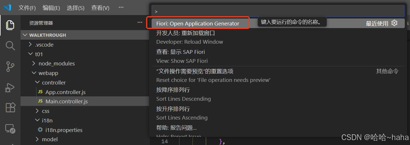 第一次新建文件夹Walkthrough,vs 打开新建文件夹,ctrl+shift+p 转到命令行,新建第一个fiori程序,步骤如下
