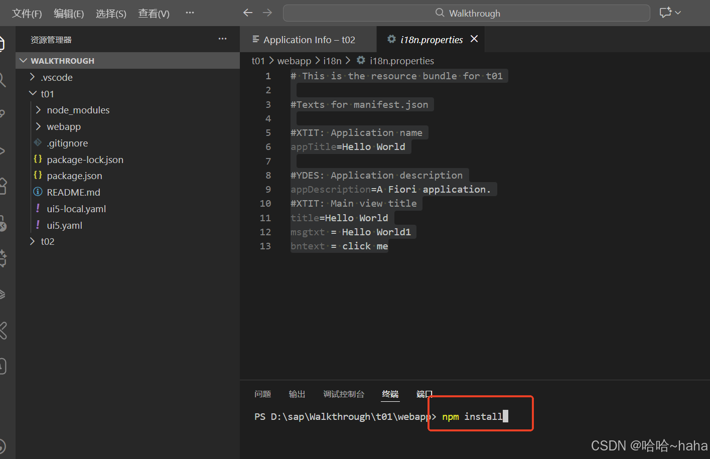 修改t01\webapp\i18n\i18n.properties文件如下,我理解的i18n相当于abap开发中的文本元素,前面view文件中的按钮文本及点击后的消息提示文本都需要在i18n.properties文件中添加