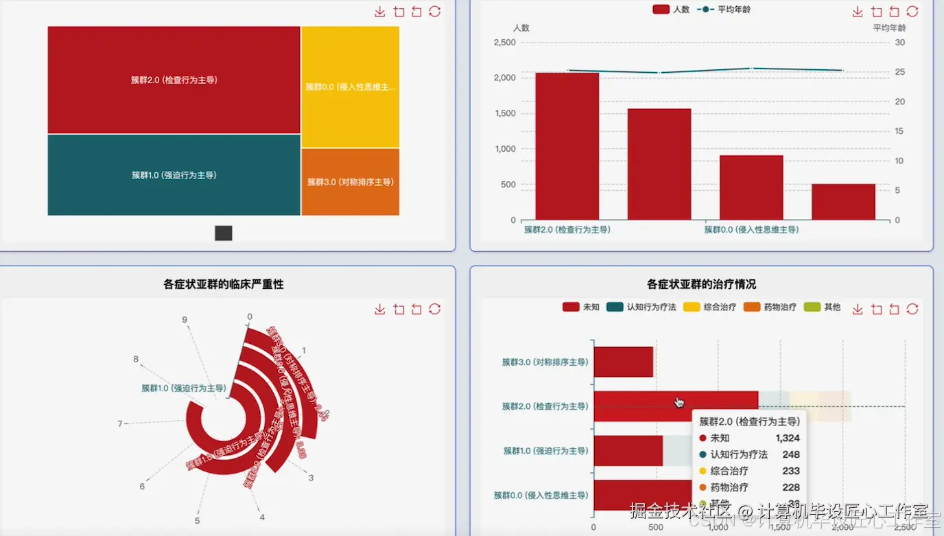 本系统是一个基于大数据技术的强迫症特征与影响因素数据分析系统,旨在为心理健康领域的研究提供一个高效、可扩展的数据处理与分析平台。系统整体采用Hadoop生态进行构建,利用HDFS作为底层分布式文件系统,实现对大规模问卷数据的可靠存储。核心计算引擎采用Apache Spark,通过其内存计算能力,对海量数据进行快速清洗、转换和多维度分析,远超传统单机处理工具的性能瓶颈。系统后端采用Python语言开发,利用PySpark无缝对接Spark集群,实现了从数据预处理、特征工程到高级分析的完整流程。具体功能涵盖了四大核心模块:首先,对强迫症患者的人口学特征进行深入剖析,包括年龄、性别、教育水平与病情严重度的交叉分析;其次,对临床特征进行量化研究,探究每日仪式时长、痛苦程度等功能损害指标与病情的关联性;再者,系统对诊断与治疗现状进行统计,揭示不同严重程度下的治疗模式;最后,也是本系统的亮点,系统利用K-Means等机器学习聚类算法,基于患者的核心症状得分进行智能分群,识别出具有不同症状主导模式的强迫症亚型,并为每个亚群绘制详细的人口学与临床画像,从而为精细化诊断和个性化治疗方案的探索提供数据支持与新的视角。