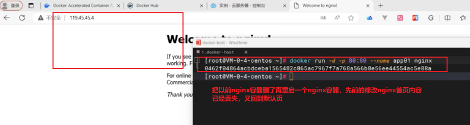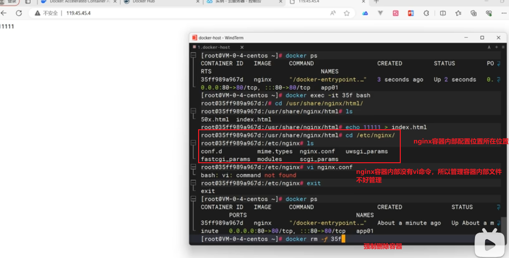 强制删除容器+重启新容器,发现修改内容丢失(看最后一张图):