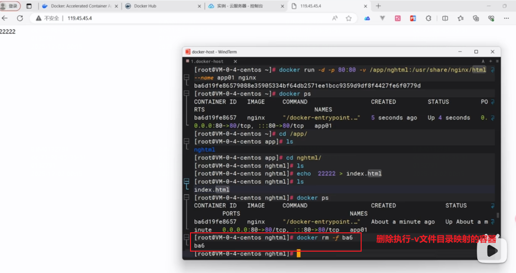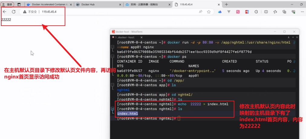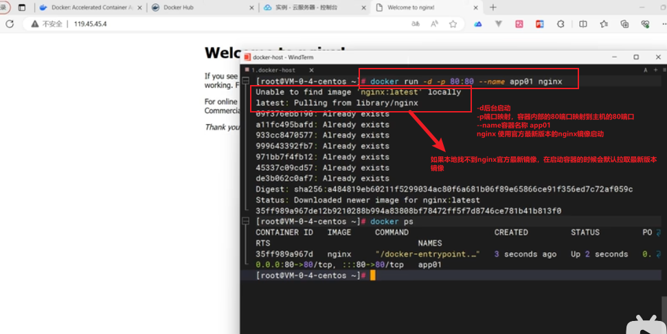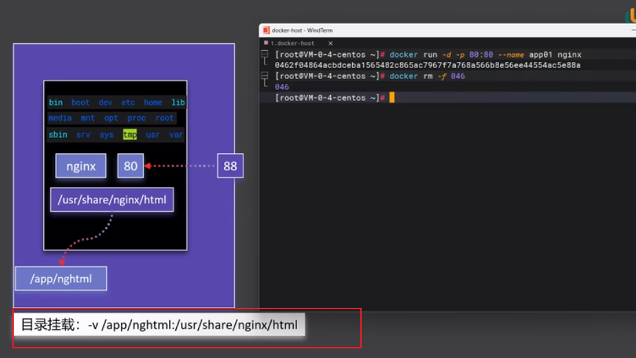docker run -d -p 80:80 -v /app/nghtml:/usr/share/nginx/html --name app01 nginx:用官方nginx最新镜像启动叫app01的nginx容器,端口映射为主机上的80对应容器内部的80端口,文件目录映射为主机上的/app/nghtml目录下的文件对应容器内的/usr/share/nginx/html目录下的文件