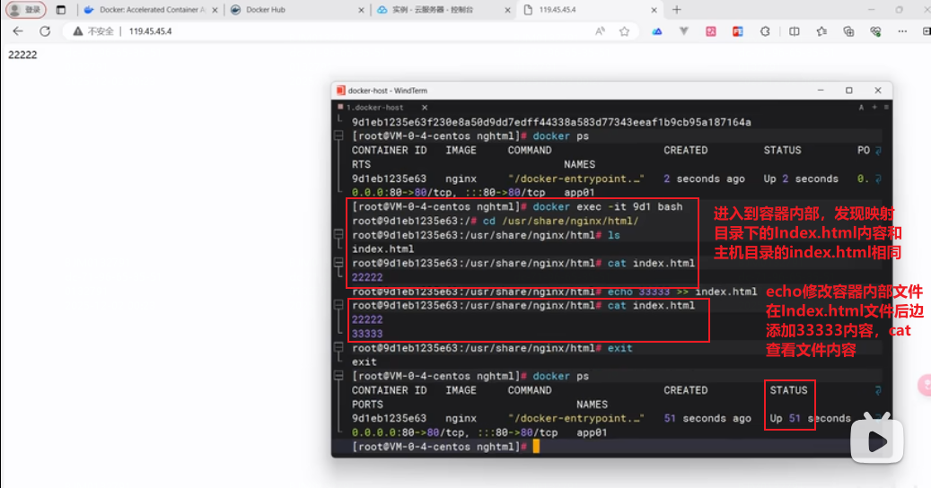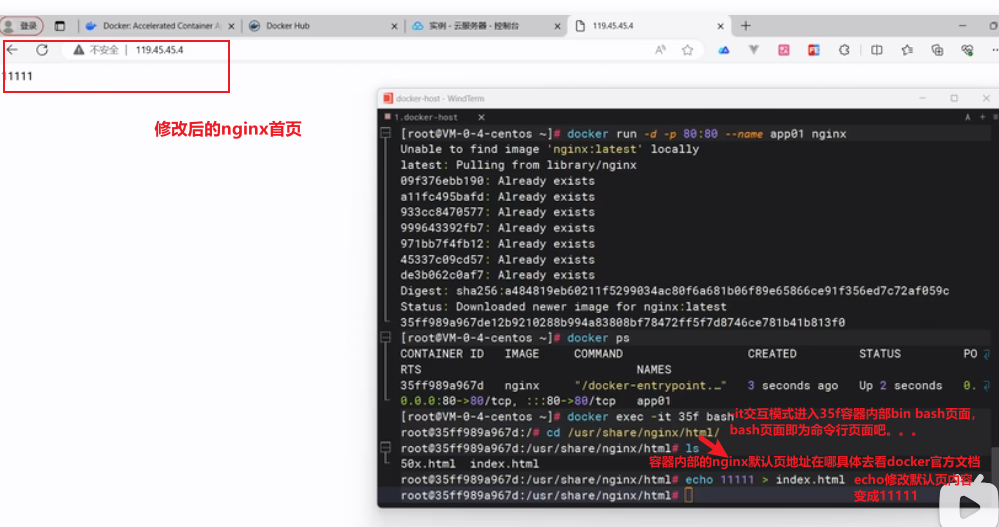 后台启动nginx容器+修改nginx容器内部默认页内容: