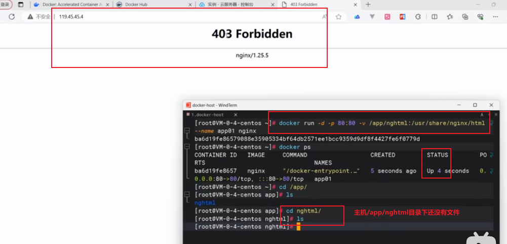 注意:开始启动后马上在浏览器访问nginx,此时nginx首页访问显示403,因为用了-v文件目录映射后,此时访问容器走的文件目录路径为映射好的主机文件目录路径而不是容器内部的/usr/share/nginx/html目录,主机文件目录/app/nghtml下并没有index.html文件,所以nginx首页访问失败
