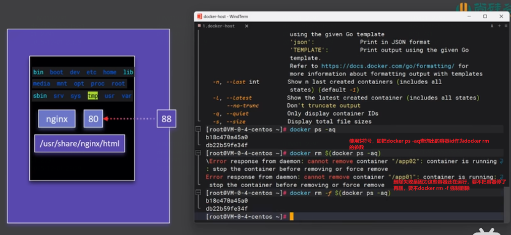 批量强制删除容器(使用强制是因为容器还是运行状态,如果不使用强制删删不了,得先停止容器才能删):docker rm -f $(docker ps -aq) -f强制删除的容器id为docker ps -aq查询出来的所有容器id