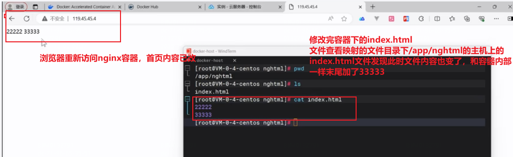 要修改docker容器nginx容器的默认首页需要使用docker exec命令进入docker容器内部再使用echo命令修改/usr/share/nginx/html页面,比较麻烦,并且docker容器内部有自己的文件系统,所以容器内部的数据都存在容器内,当把已启动且运行过的nginx容器删除,然后再重新启动一个nginx容器,则开始在第一个nginx容器中修改的nginx首页等数据就会丢失