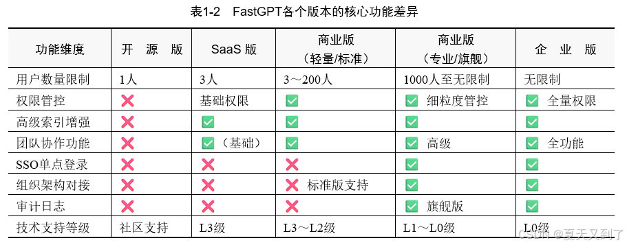 FastGPT各个版本的核心功能差异如表1-2所示。