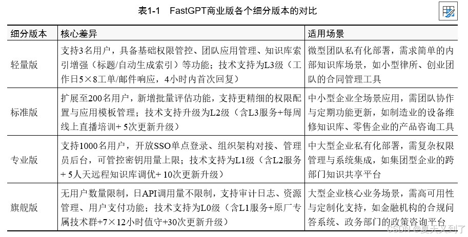 商业版作为FastGPT的主流企业级方案,分为轻量版、标准版、专业版、旗舰版,支持单机买断或按年订阅,核心差异体现在用户规模、功能深度与技术支持等级,如表1-1所示。