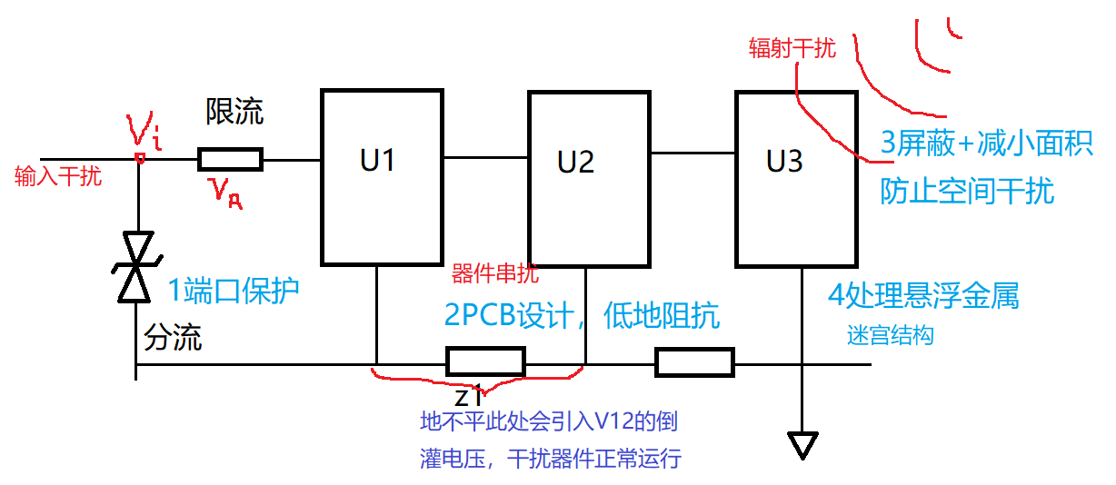 端口保护设计,防静电干扰 PCB设计,保证低地阻抗(否则可能形成不同Unit之间的压差导致相对电压过大,尤其对通信有影响) 增加屏蔽设计,减小信号线长度,减少信号回路包围的面积,用以降低空间辐射的干扰 仔细处理悬浮金属(定位孔,螺钉)
