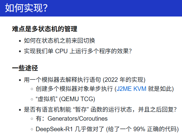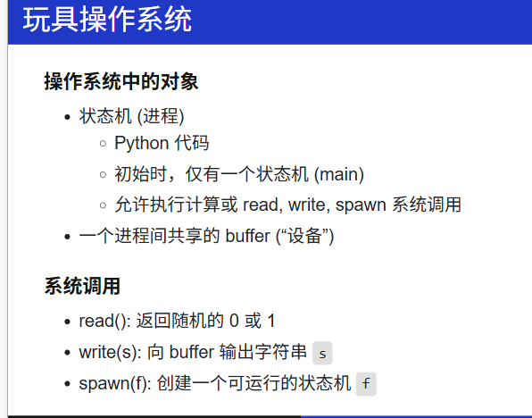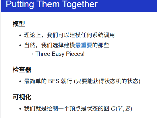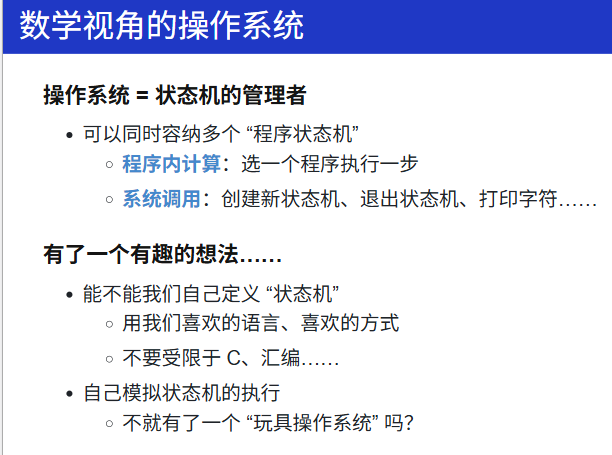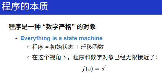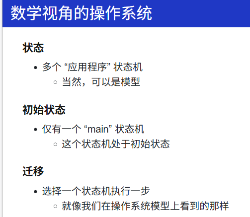 Take-away Messages: 程序就是状态机;状态机可以用程序表示。因此:我们可以用更 "简单" 的方式 (例如 Python) 描述状态机、建模操作系统上的应用,并且实现操作系统的可执行模型。而一旦把操作系统、应用程序当做 "数学对象" 处理,那么我们图论、数理逻辑中的工具就能被应用于处理程序,甚至可以用图遍历的方法证明程序的正确性。