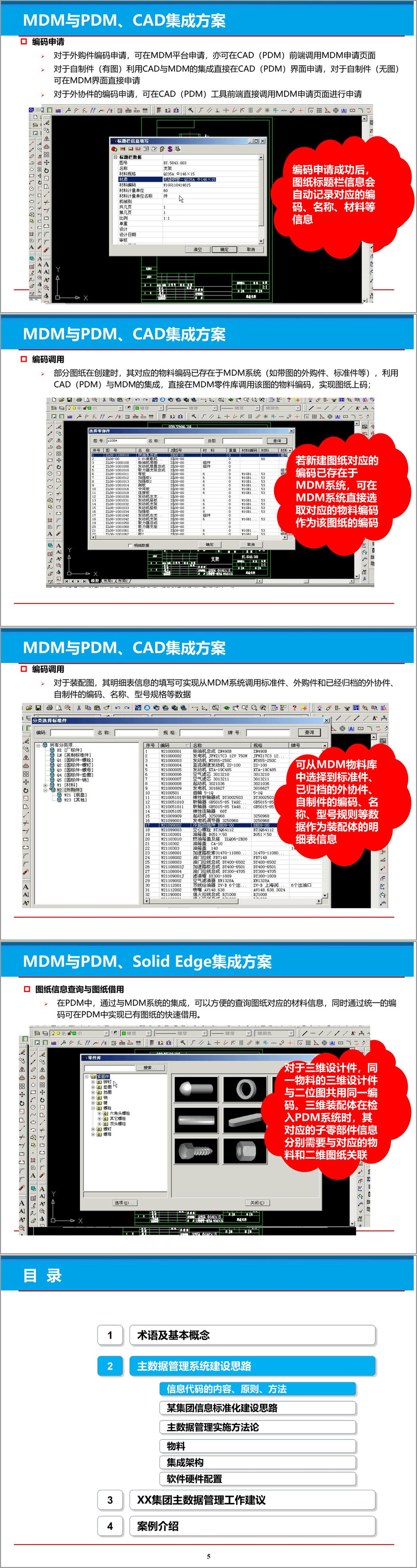 方案特别强调了主数据管理系统与现有业务系统(如CAD、PDM、ERP)深度集成的重要性。例如,在设计环节,可实现从CAD/PDM前端直接调用MDM接口进行编码申请或查询;编码成功后,信息可自动回填至图纸标题栏;在PDM中能方便地查询物料信息,促进图纸借用,从而在源头确保数据一致,打通设计、制造、采购、库存等环节的数据流。