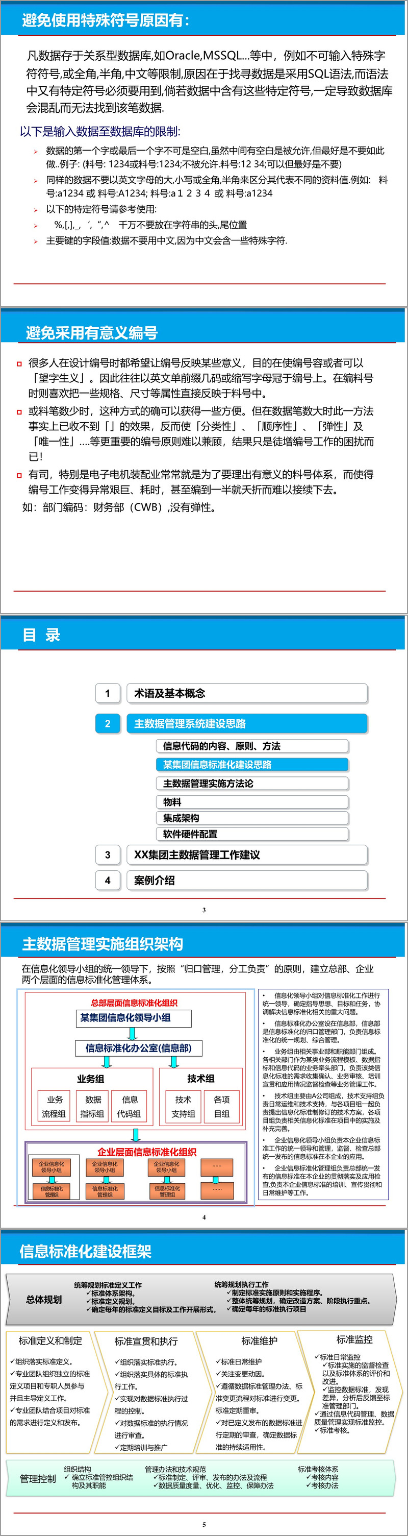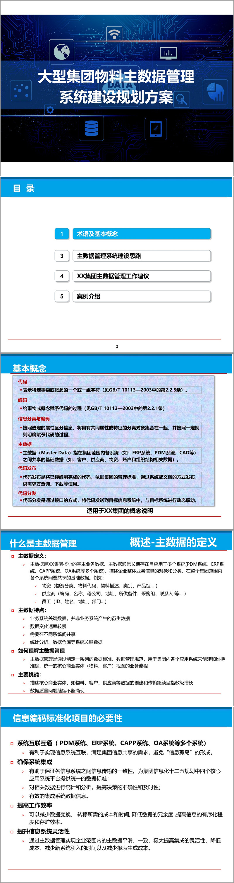 目标与内容:总体目标是建立集团主数据标准和集中管控能力。具体包括六项工作:建立信息代码体系表;制定主数据标准;编制主数据代码库;搭建主数据管理平台;开发与各业务系统的数据集成接口;建立信息化标准维护体系。初期建议以物料主数据(特别是外购件和自制通用件)为重点,逐步扩展到客户、供应商等主数据。