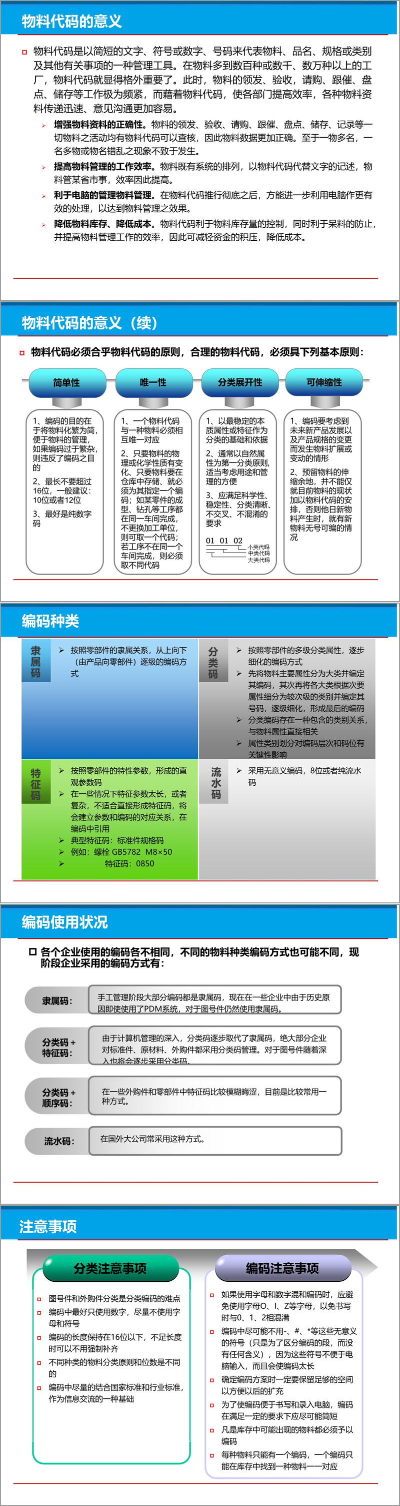 物料代码作为主数据管理的关键载体,其意义被着重强调。它不仅是物料的唯一标识符,更是提升物料管理效率、增强数据准确性、支持计算机化管理、降低库存成本的基础。方案明确了物料编码的核心原则:简单性(长度建议不超过16位,优选纯数字码)、唯一性(一物一码,严格对应)、分类展开性(按稳定属性科学分类,清晰不交叉)以及可伸缩性(为未来扩展预留空间)。同时,方案提醒应避免使用易混淆的字母(如O、I)和无意义的特殊符号,并批判了过度追求"有意义编号"的倾向,认为这会牺牲分类性、顺序性和弹性等更重要的原则。